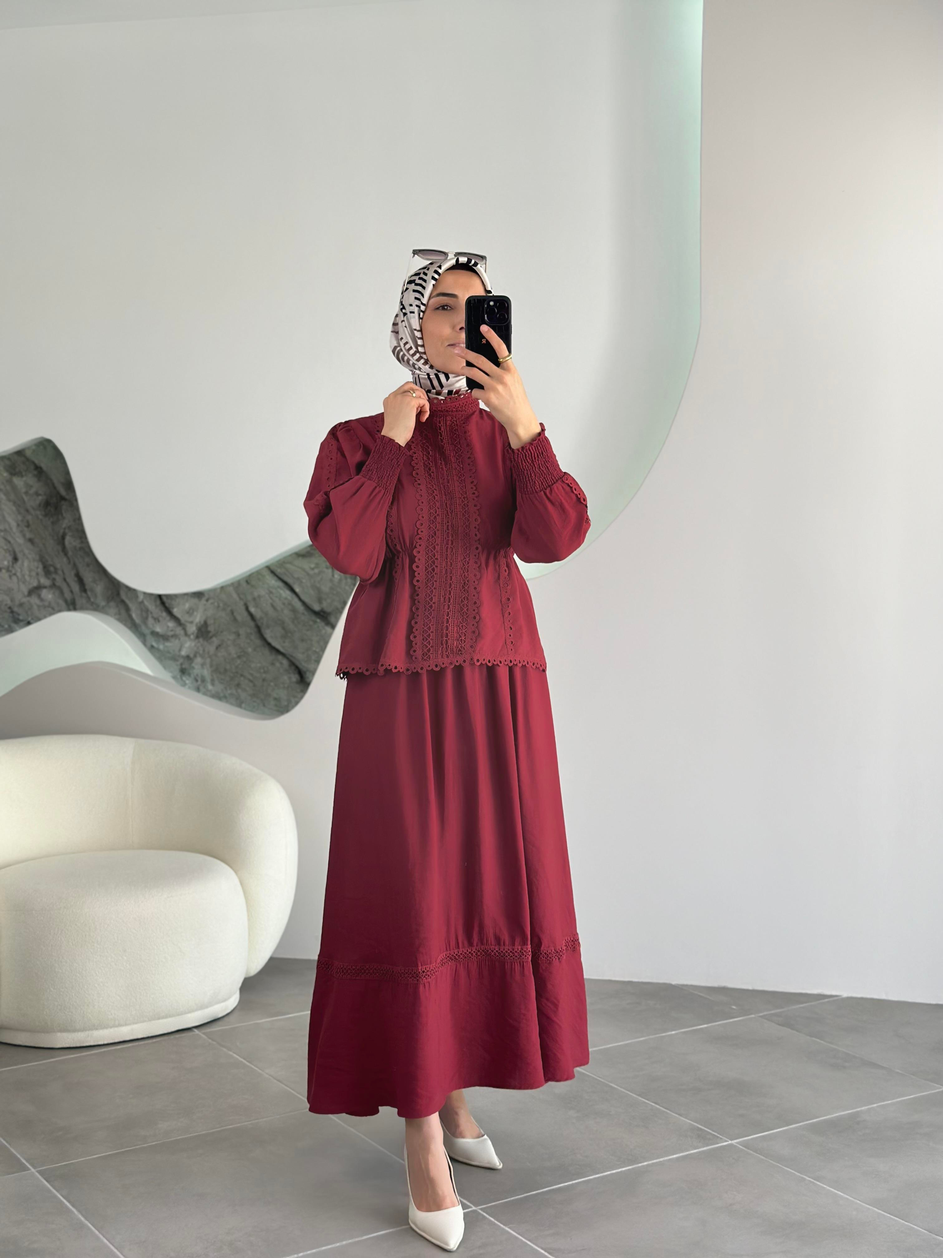 Güpür Garnili Bordo Renk Kadın Etekli Takım