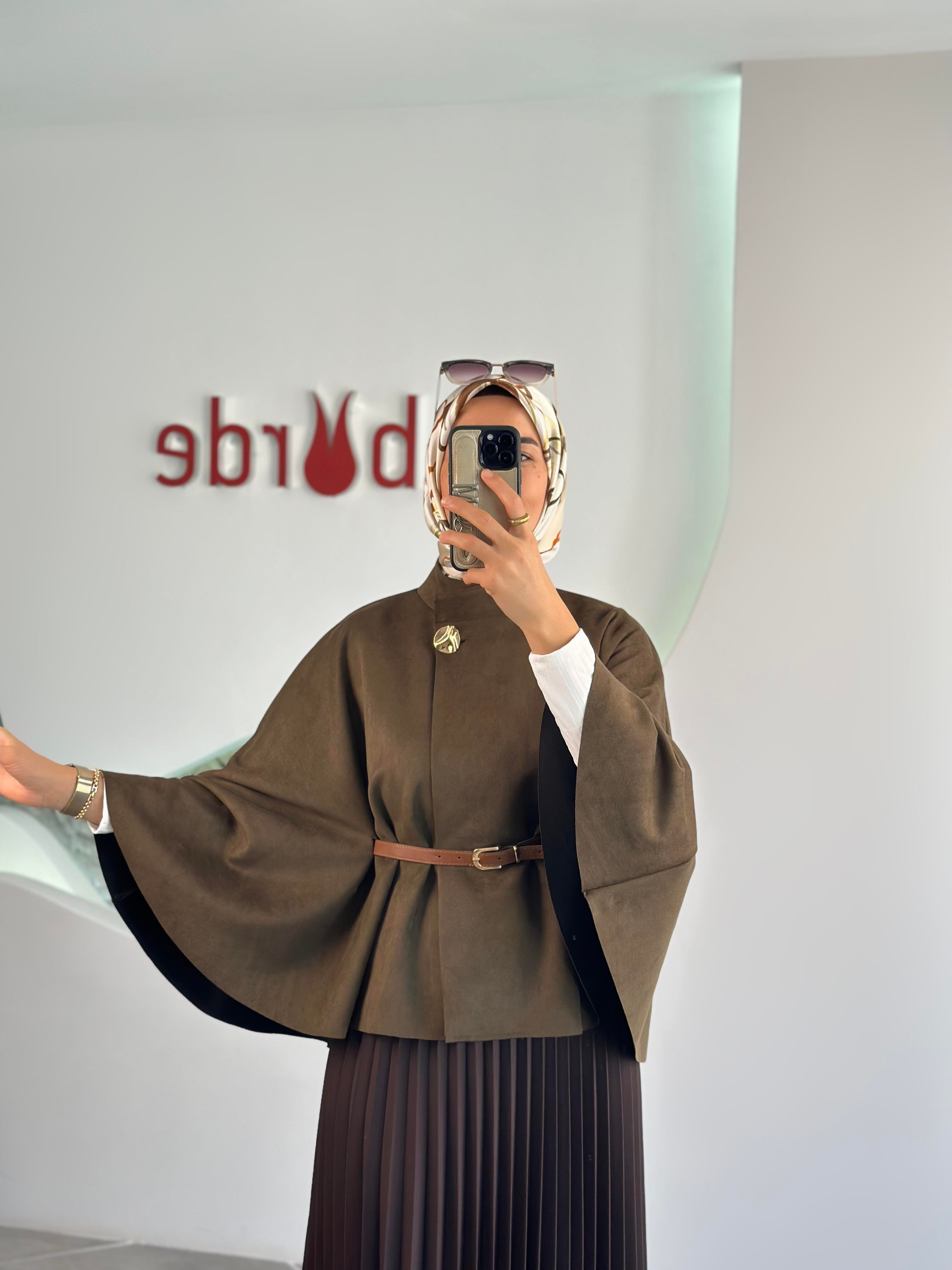 Kemerli Haki Renk Kadın Panço Ceket (4036-1)
