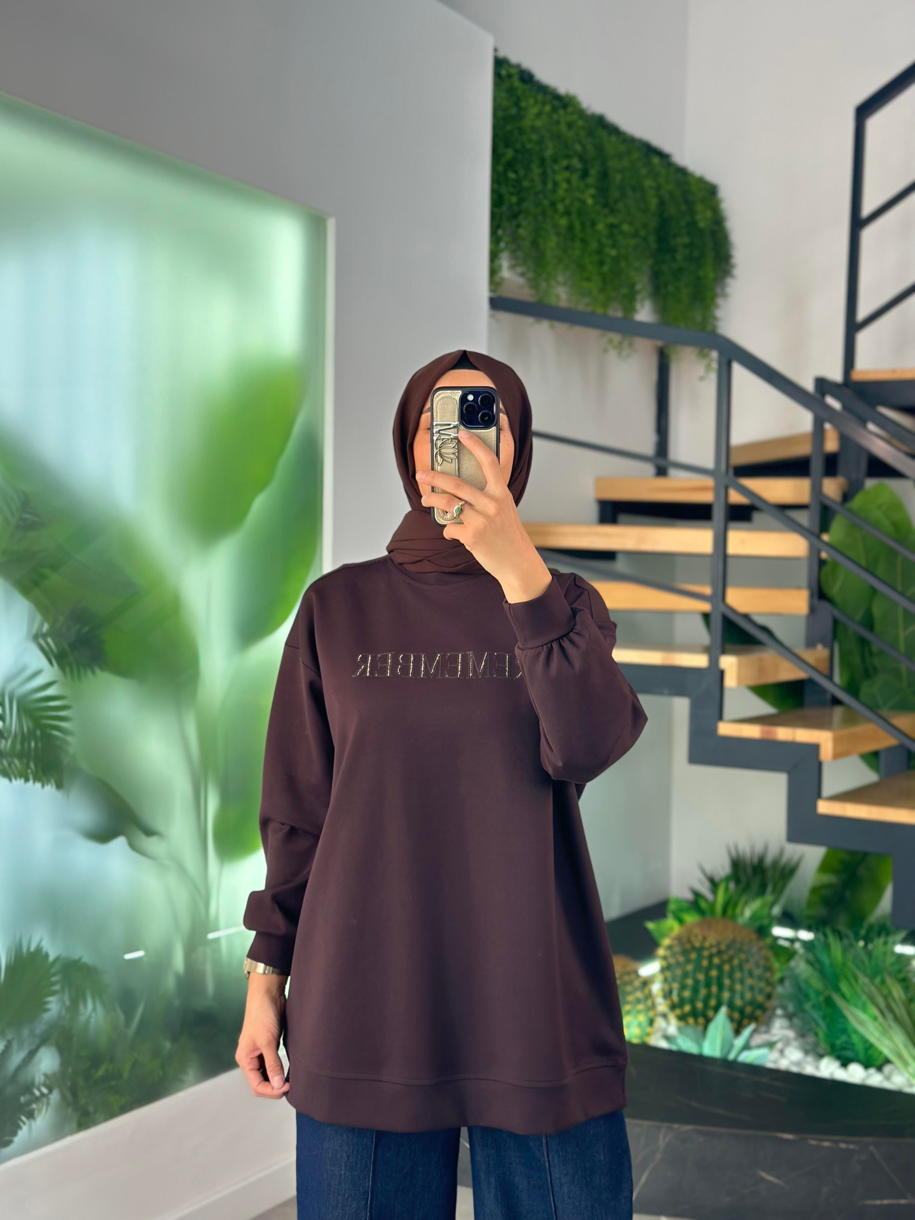 Tonaton Baskı Ve Taşlı Kahve Renk Kadın Sweatshirt (35782)